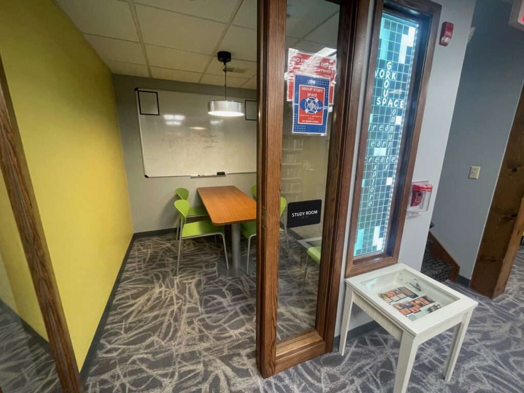 Equipped with a small table, two chairs, a window and white board, it is a great space to have a one-on-one meeting or work independently.