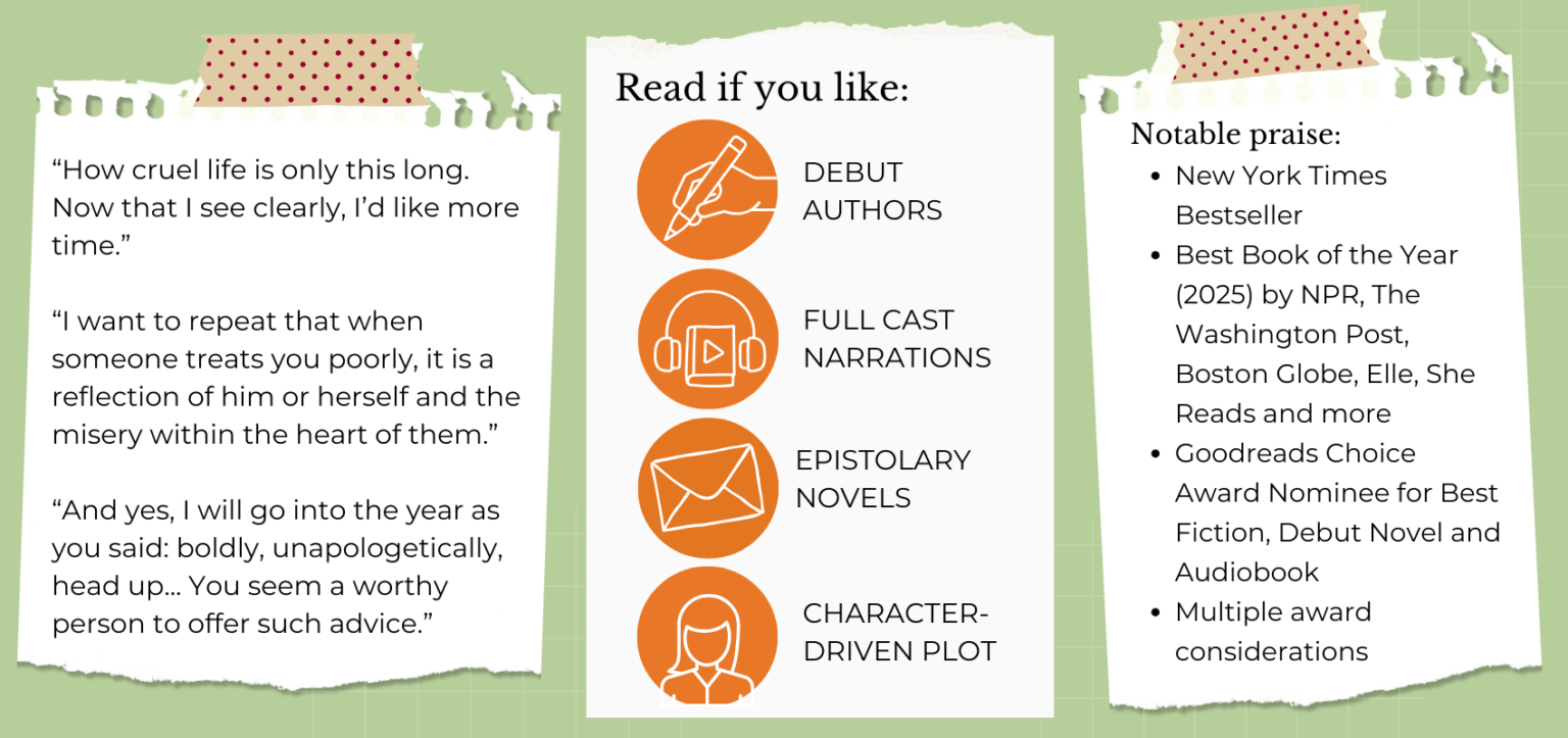 I am a big fan of ‘snail mail’. In today’s world, I crave the intimacy of putting pen to paper and the delayed gratification of receival. So picking up an epistolary novel was a no brainer. However, imagine my surprise when I discovered I prefer the audio version – choosing to listen to the letters, instead of reading them. The audiobook is performed by a full cast (my favorite!) who bring added emotional depth to the story.